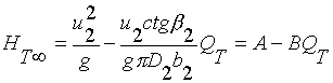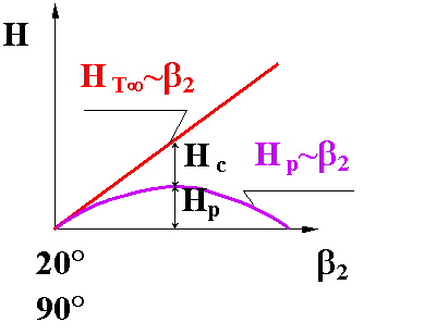 上圖表示了HT∞與QT的線(xiàn)性關(guān)系,斜率隨著(zhù)β2變,后彎葉片的HT∞--QT的關(guān)系曲線(xiàn)稱(chēng)為離心泵的“理論特性曲線(xiàn)”。