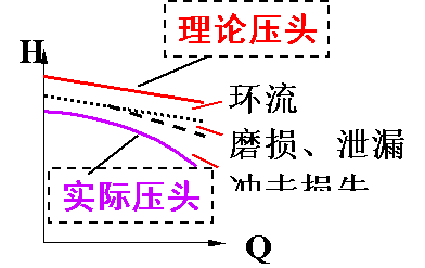 實(shí)際生產(chǎn)中,A、葉片時(shí)有限的,液體流動(dòng)時(shí)會(huì )產(chǎn)生與流動(dòng)方向不一致的“軸向渦流”→H↓;B、實(shí)際流體與葉輪、泵殼等流道上的元件間不可避免的能量損失→H↓;C、泵內各種泄漏損失:高壓液體的部分回流、平衡孔的回流液、軸封處的泄漏→Q↓。