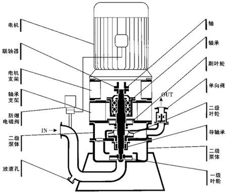 WFB型無(wú)密封自控自吸泵主要由泵體、葉輪、泵蓋、導葉、副葉輪、泵軸、連接架、電動(dòng)空氣控制閥等部分組成。該泵體內部由吸入室、儲液室、氣液分離室等部分組成。泵在正常起動(dòng)后,葉輪將吸入室所存的液體及吸入管路中的空氣一起吸入,液體混合氣體在葉輪高速旋轉的離心力作用下經(jīng)導葉拋入氣液分離室,由于流速突然降低,氣體與液體的比重不同,較輕的氣體從混合液中分離出來(lái)并被排出泵外,脫氣的液體重新進(jìn)入工作腔與葉輪內部從吸入管路中吸入的空氣再次混合,在葉輪的旋轉的作用下,很快使泵體入口形成一定的真空度,從而達到自吸的目的。由于該泵具有獨特的排氣功能,因此該泵能輸送含有氣體的液體并無(wú)須安裝底閥。該泵配有“電動(dòng)空氣控制閥”運行時(shí),控制閥關(guān)閉,實(shí)現密封;停機后控制閥打開(kāi),破壞了吸入管路中的真空,防止停機后泵腔內的液體因缸吸作用而眾吸入管路流出,使泵腔內保存足夠的液體來(lái)繼續完成自吸過(guò)程,從而實(shí)現了“首次引流、永久自吸”。