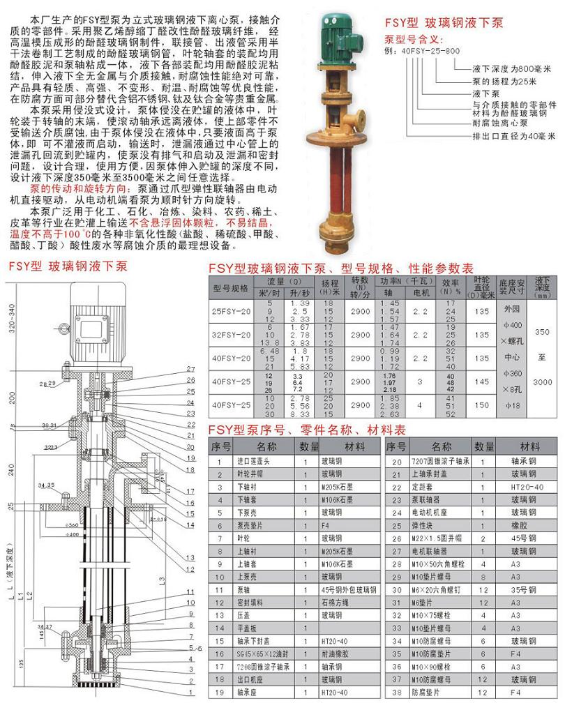 玻璃鋼(酚醛樹(shù)脂)對非氧化性酸(鹽酸、稀硫酸、磷酸等)、鹽類(lèi)溶液、水都有良好的耐蝕性,不耐堿和氧化性酸(硝酸、鉻酸等)的腐蝕,高耐溫度約為120~150℃,低溫度為-20℃。本單位應用此材料生產(chǎn)的SY型立式玻璃鋼液下泵、WSY型泵為立式玻璃鋼液下旋渦泵、FSY型泵為立式玻璃鋼液下離心泵。該泵因伸入貯罐,貯槽的深度長(cháng)短不同,設計液下深度500mm--3000mm之間任意選擇。只要液體高于泵體,即可不灌液而起動(dòng)送液,平蓋板下設有泄漏孔,液體不會(huì )向貯罐外泄漏。