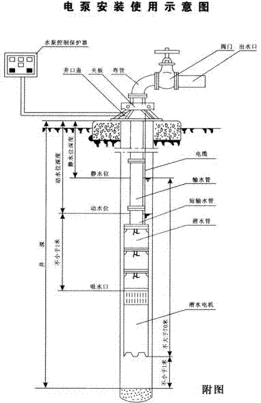 2.水泵進(jìn)水口必須在動(dòng)水位1米位以下,但潛水深度不得超過(guò)靜水位以下70米,電機下端距井底水深少在1米以上。