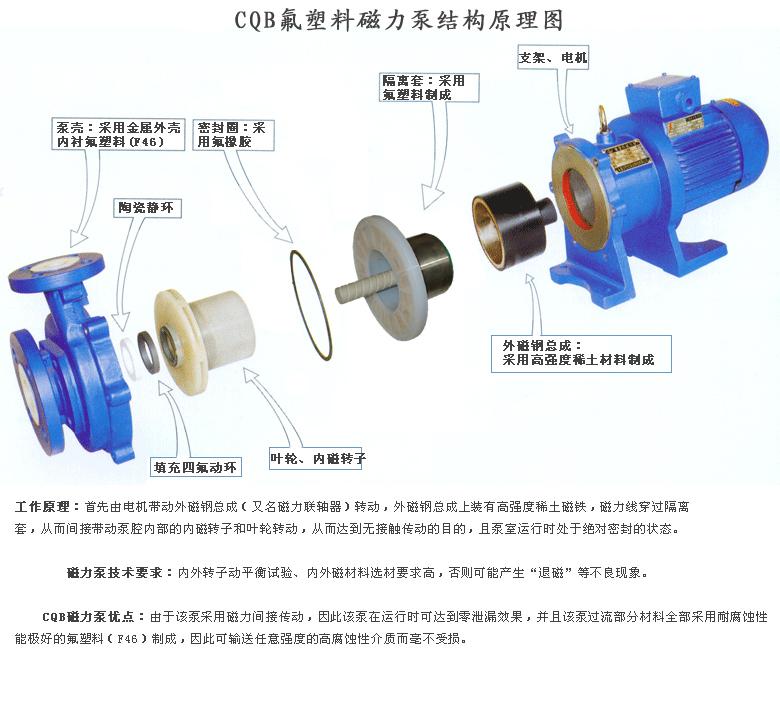 CQB型氟塑料磁力泵是應用現代磁力學(xué)原理,利用永磁體實(shí)現無(wú)接觸間接動(dòng)的一種化工流程泵。當電機帶 動(dòng)外轉子(即外磁鋼)總成旋轉時(shí),通過(guò)磁場(chǎng)的作用磁力線(xiàn)穿過(guò)隔離套帶動(dòng)內轉子(即內磁鋼)總成和葉輪同步旋轉,介質(zhì)完全封閉在靜止的隔離套內,從而達到無(wú)泄 漏抽送介質(zhì)的目的,徹底解決了機械傳動(dòng)泵的軸封泄漏,是全密封、無(wú)泄漏、無(wú)污染的新型工業(yè)泵。