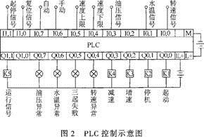 圖2為智能型柴油機泵組自動(dòng)控制部分硬件線(xiàn)路電路圖。智能控制器采用德國西門(mén)子的S7—200系列產(chǎn)品,各種輸入信號通過(guò)開(kāi)關(guān)按鈕及相關(guān)傳感器從現場(chǎng)采集。輸出信號通過(guò)各種執行器控制柴油機的運行狀態(tài)。