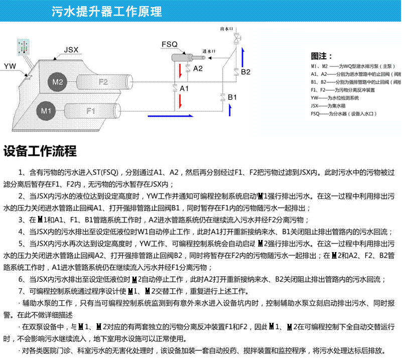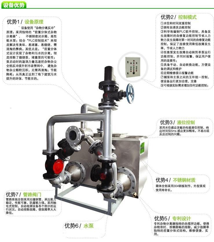 全自動(dòng)地下污水提升器(提升設備)是一款適用于餐飲業(yè)、娛樂(lè )行業(yè)、休閑服務(wù)業(yè)、建筑工程、商業(yè)工程、化工廠(chǎng)、生產(chǎn)加工廠(chǎng)、制藥廠(chǎng)、醫用、市政工程等地下污水排放系統的全自動(dòng)地下污水提升器。污水處理一直都是令人頭疼的問(wèn)題,傳統的做法都是在地下挖集水井(污水坑),在集水井中放置污水泵,也就是俗稱(chēng)的“一坑兩泵”,一坑兩泵的污水處理的方式存在異味、污水泵易堵塞、污水坑清掏難、污染周?chē)h(huán)境等弊病。金利潔牌PW系列全自動(dòng)污水提升器采用雙泵雙分離器,雙泵雙分離器交替工作,互為備用,任意泵發(fā)生故障都可以在PLC控制系統下自動(dòng)轉到單泵運行控制,滿(mǎn)足地下污水持續提升排放的需要。雜物分離專(zhuān)利技術(shù)更是解決了易堵塞、清掏難的問(wèn)題,污物被濾網(wǎng)濾出,暫存機體,后隨水流壓力自行排出,實(shí)現真正的免清掏,污物并不接觸水泵葉輪,不會(huì )因污物纏繞造成堵塞,整個(gè)污水處理過(guò)程都是在密閉性良好的不銹鋼箱體中進(jìn)行,不會(huì )出現污水和異味外泄的情況。傳統的利用兩個(gè)液位控制水泵的啟停很容易出現低液位不識別的問(wèn)題,使水泵失去控制,而全自動(dòng)地下污水提升器采用PLC控制系統結合高液位一個(gè)高液位的獨有技術(shù),很好的解決了低液位不識別問(wèn)題,響應時(shí)間僅為5ms,感應更靈敏,反應更快。