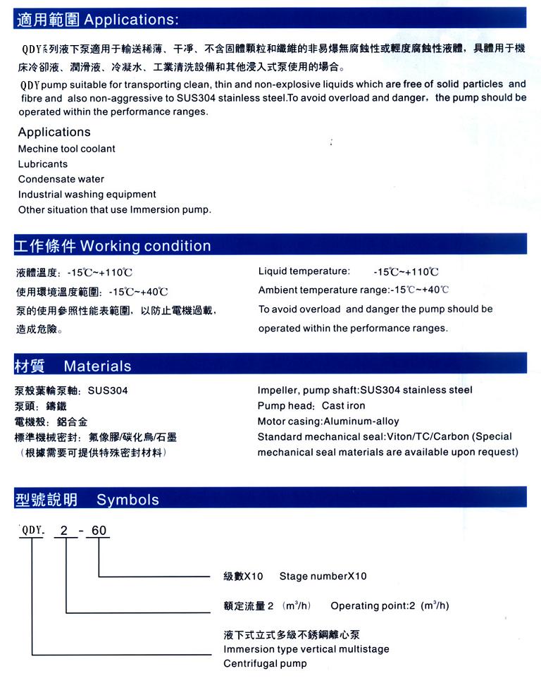 QDY不銹鋼多級液下泵主要零部件如葉輪、導流器、泵軸用不銹鋼制造,不銹鋼多級液下泵所有過(guò)流部件、觸液部件均為不銹鋼制造,具有良好的耐腐蝕性能,采用硬質(zhì)合金軸承及機械密封,剛性聯(lián)軸器傳動(dòng),具有體積小、重量輕、抗腐蝕、振動(dòng)小、噪音低、占地面積小、使用壽命長(cháng),外形美觀(guān)等特點(diǎn),特別是高效、節能等優(yōu)點(diǎn)。
