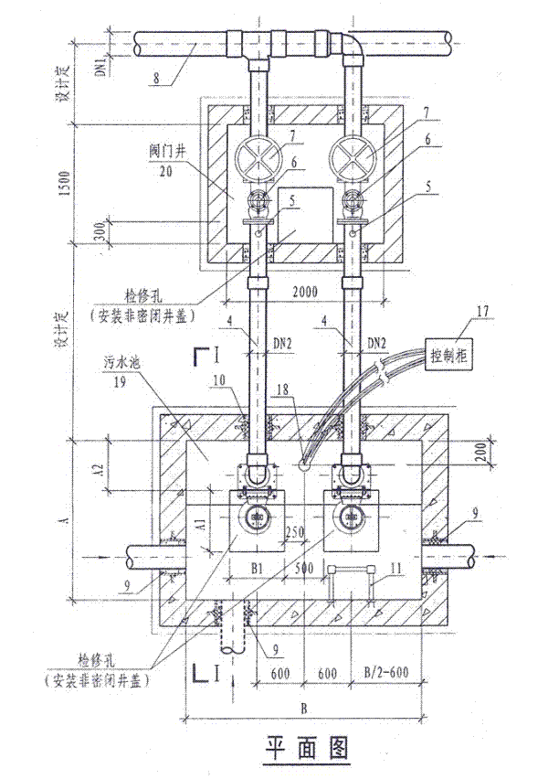 說(shuō)明:1.本圖潛水排污泵采用液位自動(dòng)控制。兩臺泵輪換工作,互為備用。h1為開(kāi)泵水位,h0為停泵水位,當水位高出報警水位100mm時(shí)備用泵自投。