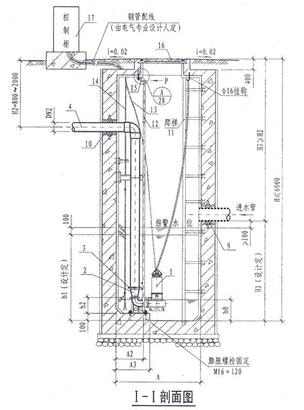 4.潛水排污泵控制柜安裝位置由單項工程設計考慮,其型號規格可由泵廠(chǎng)配套供應。池外電線(xiàn)電纜應穿管敷設。