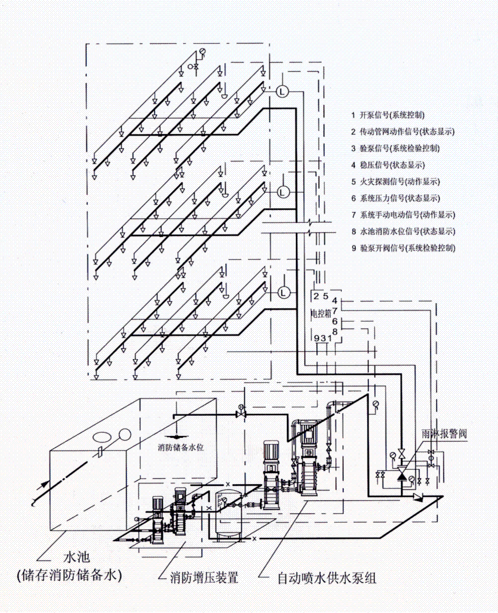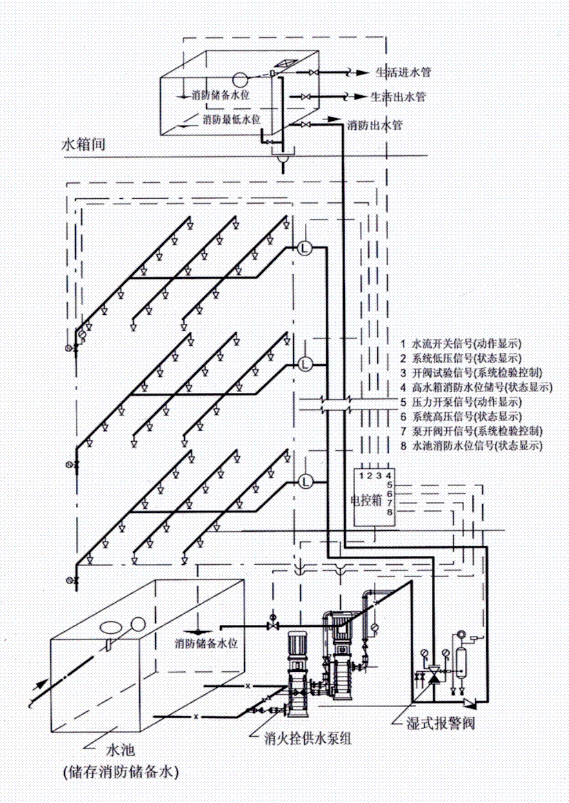 自動(dòng)噴水濕式系統(高水箱穩壓)原理圖