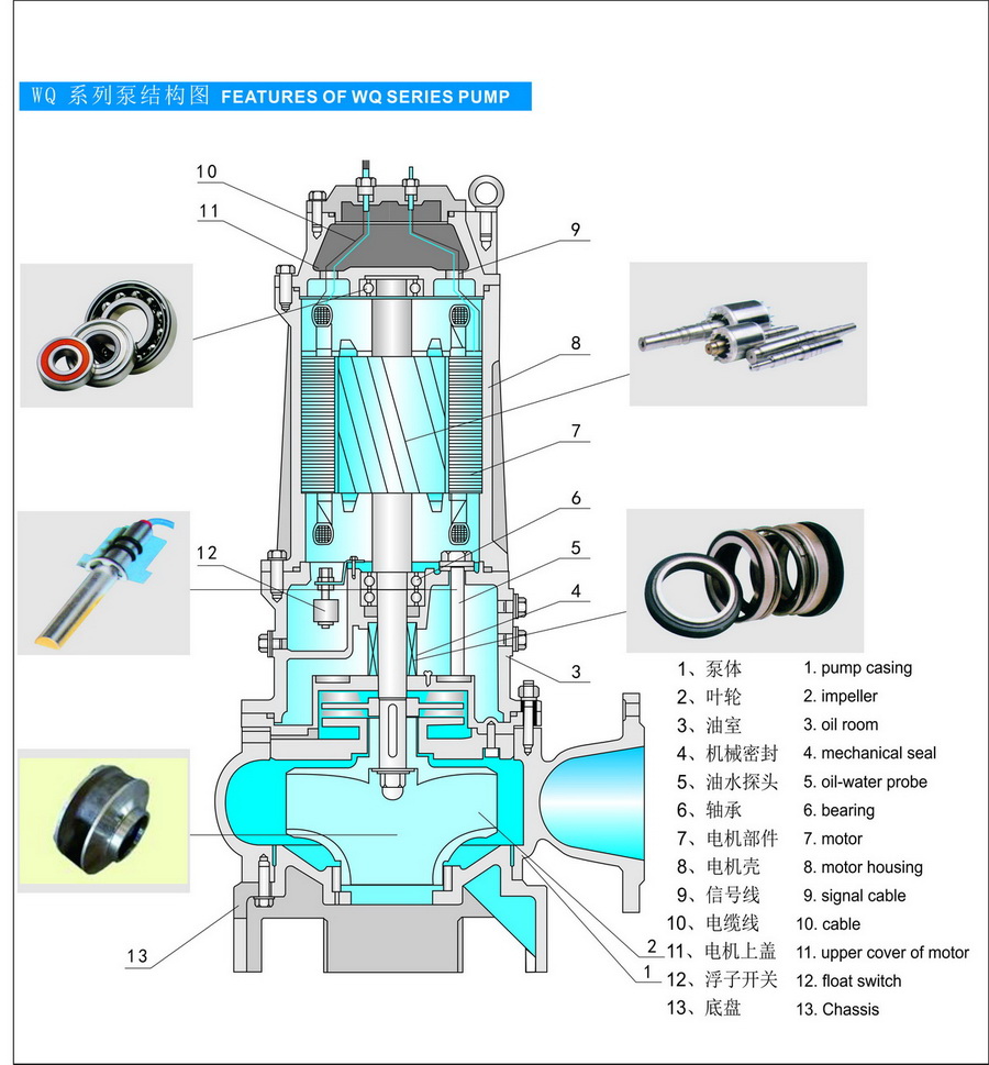 WQP型不銹鋼排污泵由電機與泵兩部分組成,二者通過(guò)油隔離室及機械密封組件隔幵,屬機電一體化產(chǎn)品, 電機與泵合用同一軸(轉子)整個(gè)水泵長(cháng)度短,結構緊湊。配備多種保護裝置,使得泵運行安全可靠。其主要部件作用如下: