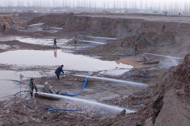 水利挖沙、挖土、沖填機組進(jìn)行水利機械化施工,是模擬自然界水流沖刷得原理,借水力的作用來(lái)進(jìn)行挖沙、挖土工作,水經(jīng)高壓泵產(chǎn)生壓力,通過(guò)水槍的噴射,射出高壓高速水柱,水柱沖擊土沙,使土沙濕化、崩解、拌合成泥漿和泥塊的混合物,再由立式泥漿泵提升,通過(guò)管道輸送到沙場(chǎng)。