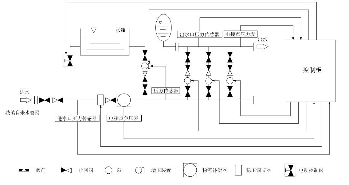 系統配有容量比較大的不銹鋼水箱,當管網(wǎng)供水不足或管網(wǎng)停水時(shí)系統自動(dòng)切換到水箱內吸水,實(shí)現連續供水。當管網(wǎng)恢復壓力時(shí)系統自動(dòng)恢復正常運行。