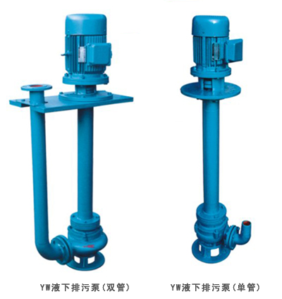 YW型液下排污泵為立式液下式結構,整泵有泵體跟電機兩大部分組成。工作時(shí)泵體浸在水中,電機露出水面工作,液下深度可達0.5~5m,并采用獨特的單葉片或雙葉片葉輪結構,能有效通過(guò)泵口徑5倍的纖維物質(zhì)及直徑為口徑50%的固體顆粒。產(chǎn)品執行JB/T6525-92《離心式污水泵的技術(shù)條件》標準。