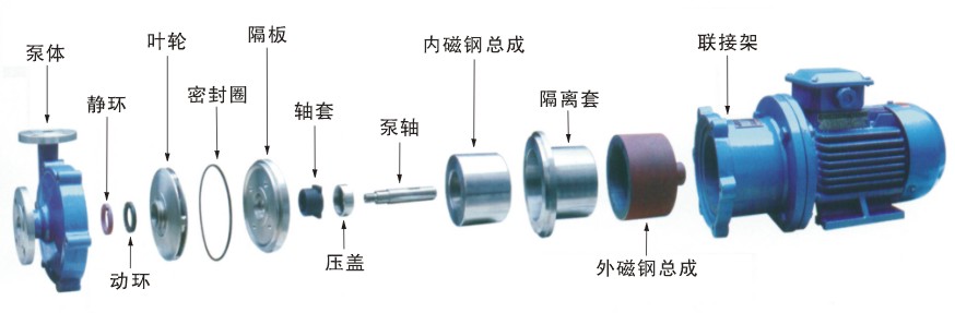 磁力泵主要構件是泵體、葉輪、內磁鋼、外磁鋼、隔離套、泵內軸、泵外軸以及滑動(dòng)軸承、滾動(dòng)軸承、聯(lián)軸器等組成。