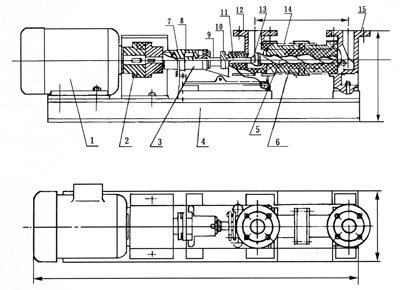 I-1B系列單螺桿濃漿泵由電動(dòng)機、聯(lián)軸器、泵和底座四個(gè)部分組成(見(jiàn)附圖)。