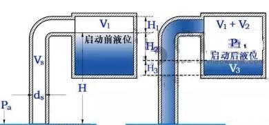 泵啟動(dòng)后,液面下降,達到穩定運行工作后,罐內應存有一定體積量V3的水,而氣體之外的罐內空氣體積為V1+V2。罐內部的壓力為P1,壓力小于外界大氣壓力Pa。