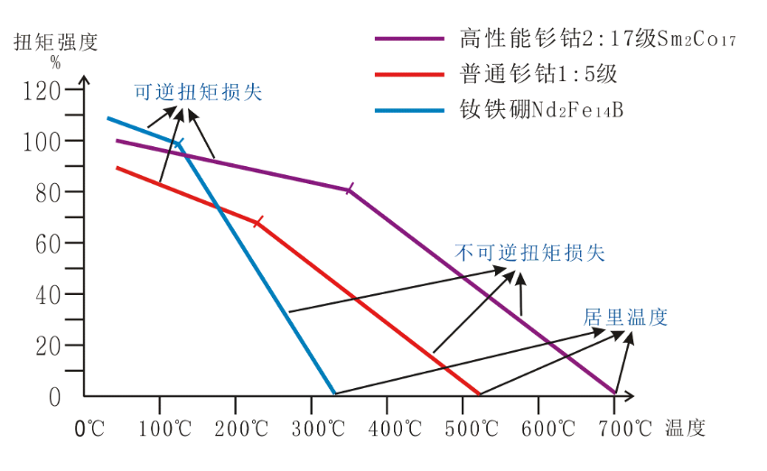 當溫度超過(guò)150℃,釹鐵硼材質(zhì)的磁鋼將會(huì )進(jìn)入不可逆扭轉損失。當溫度超過(guò)250℃,普通釤鈷材質(zhì)的磁鋼將會(huì )進(jìn)入不可逆扭轉損失。