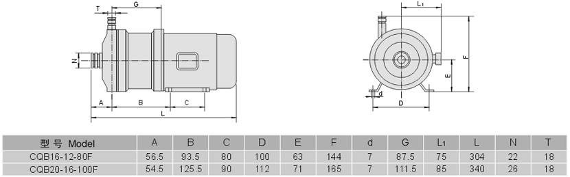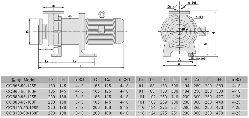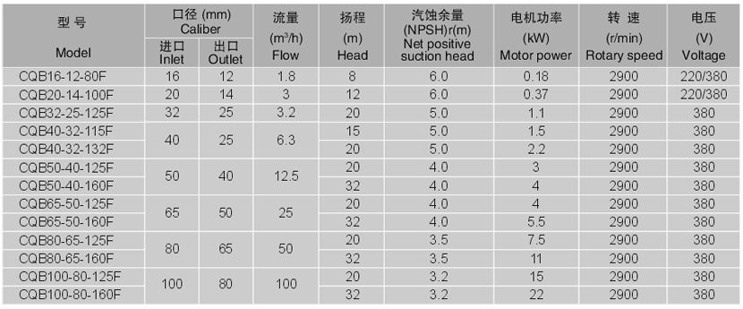 CQB-F系列全氟襯氟磁力泵性能參數型號意義安裝尺寸
