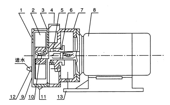 填料裝在泵體內,密封水經(jīng)泵體上的針孔流入填料中,葉輪形成水環(huán)所需的補充水經(jīng)由泵體上的彎頭供給,它可與自來(lái)水或汽水分離器聯(lián)在一起,供給循環(huán)水。
