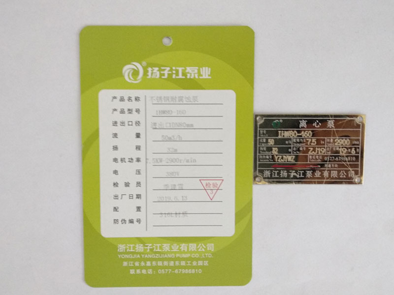 不銹鋼耐腐蝕泵產(chǎn)品合格證_浙江揚子江泵業(yè)有限公司