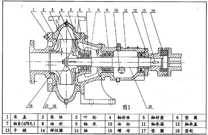 本型泵主要由:泵蓋(1),泵體(2),葉輪(3),軸(15),軸封體(4),軸承箱(11))及聯(lián)軸器部件等組成〈見(jiàn)圖1:結構圖〉