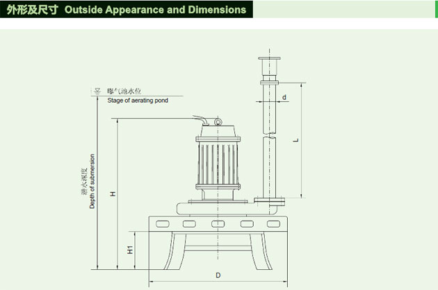 QXB型潛水離心式曝氣機采用電機和葉輪直接傳動(dòng),利用葉輪旋轉所產(chǎn)生的離心力排開(kāi)周?chē)纬傻蛪簠^吸入水流同時(shí),在葉輪進(jìn)口處制造真空而吸入空氣,在混氣室中氣與水充分混合形成均勻的氣水混合液,在離心力作用下快速排出。由于水流噴射極強,造成有效的水流循環(huán),使空氣被剪切成大量的微小氣泡。極大提高了其表面積,且由于氣泡上升緩慢使空氣中大量的氧溶于水中,使得該機動(dòng)力效率優(yōu)于其它種類(lèi)的曝氣機。