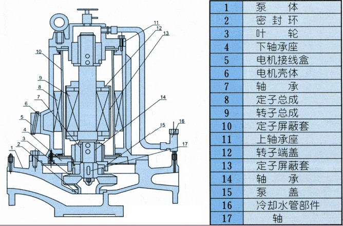 結構見(jiàn)圖。該泵為機泵一體結構,整機主要由泵體、葉輪、聯(lián)接體、滑動(dòng)軸承、定子、轉子、屏蔽套、電機殼等零部件組成。泵為立式單級單吸離心式,進(jìn)出口在同一水平軸線(xiàn)上,口徑規格相同可直接象閥門(mén)一樣安裝在管路的任何部位上,裝卸極為方便,占地面積省。泵通過(guò)聯(lián)接體與電機或一體,軸承采用進(jìn)口石墨浸漬樹(shù)脂復合軸承,電子定轉子各有屏蔽套進(jìn)行隔離。軸承采用流體本身介質(zhì)作為潤滑劑及冷卻液,具有設計合理、運行可靠的特點(diǎn)。泵設有底座,可直接安裝在地基上,因該泵具有低噪音,無(wú)振動(dòng)特點(diǎn),安裝時(shí)無(wú)需加裝隔振器或隔振墊。