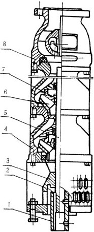 2、潛水泵每級導流殼中裝有一個(gè)橡膠軸承;葉輪用錐形套固定在泵軸上;導流殼采用螺紋或螺栓聯(lián)成一體。