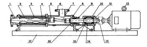 1 出料腔 2 拉桿 3 螺桿膠套 4 螺桿軸 5 萬(wàn)向節總成 6 吸入口體