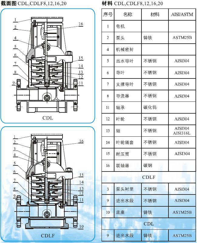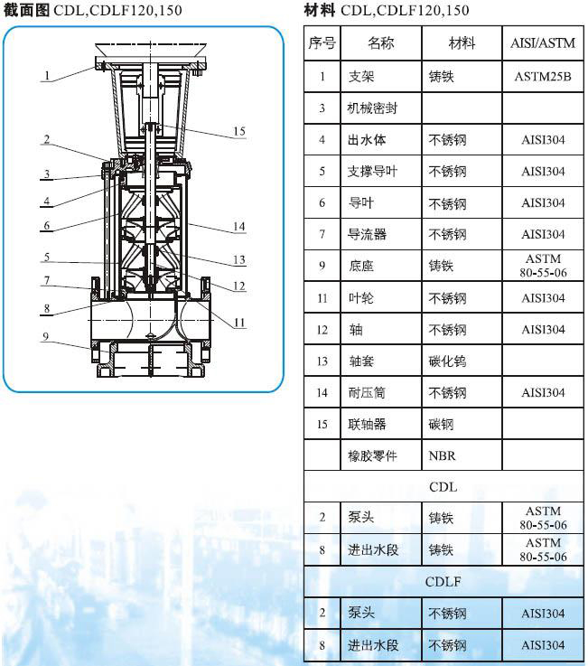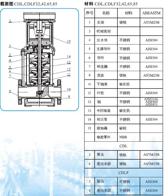 CDLF系列輕型不銹鋼立式多級管道泵(以下簡(jiǎn)稱(chēng)泵)是吸取了國內外先進(jìn)技術(shù)而設計制造的非自吸立式多級管道泵,采用標準立式電機和快裝式機械密封,更換非常方便。泵的過(guò)流部分均采用不銹鋼(304\316)材料制成,可適用于輕度腐蝕性介質(zhì)。該產(chǎn)品可替代國外CR、CRN等同類(lèi)產(chǎn)品。產(chǎn)品投放市場(chǎng)后,以其高效節能、質(zhì)量可靠、使用范圍廣等特點(diǎn),深受廣大用戶(hù)的喜愛(ài)。