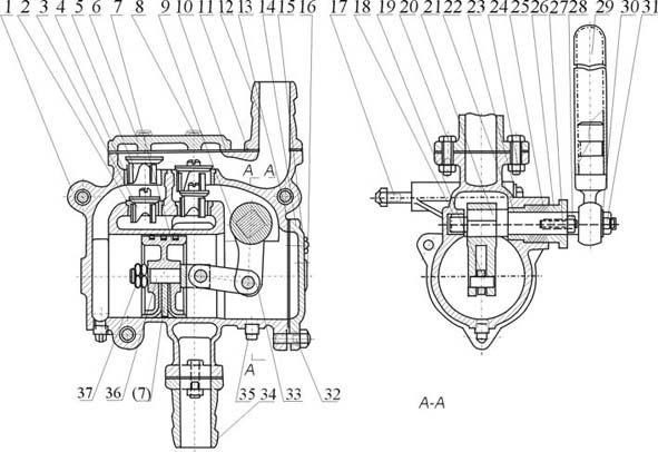 連桿(36)等傳動(dòng)機構,使活塞(7)作往復運動(dòng)。如圖所示,當活塞向左移動(dòng)時(shí),右端的泵缸體積逐漸擴大,形成真空,液體從吸水管(34)經(jīng)過(guò)鑄在泵體旁邊的吸入流道頂開(kāi)吸水閥進(jìn)入缸體右端。在同一時(shí)間里,缸體左側由于活塞的壓縮,使壓水閥(5)頂開(kāi),液體經(jīng)吐出管(11)排出。若活塞的運動(dòng)方向返回向右時(shí),則泵缸左側吸入液體,泵缸右側排出液體,這樣往復不歇地把液體吸入排出。形成泵的工作。泵的壓水閥向上行程由蓋板(6)限止,吸水閥向上行程由壓水閥限止。蓋板與泵體用螺栓(8)緊固,活塞行程由泵蓋(14)和泵體限止。