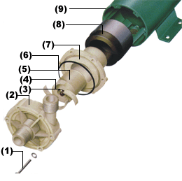 部 件 1、固定螺絲及墊圈 2、泵殼 3、泵軸 4、葉輪 5、被動(dòng)磁鐵 6、密封圈 7、隔離套 8、主動(dòng)磁鐵 9、電機 |